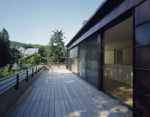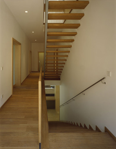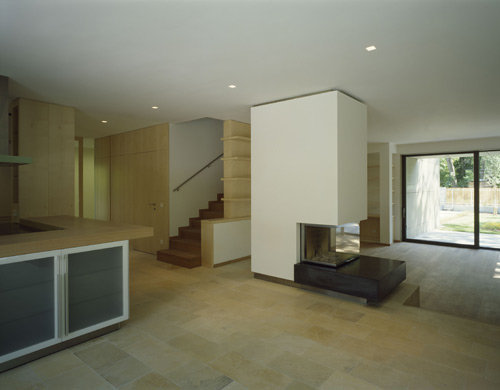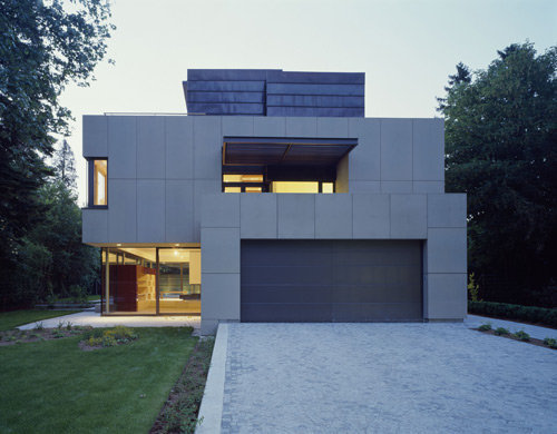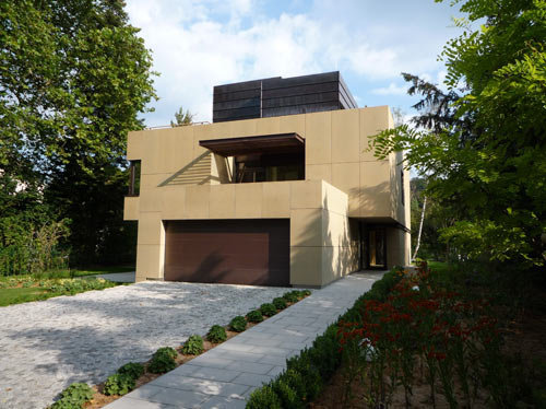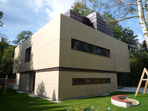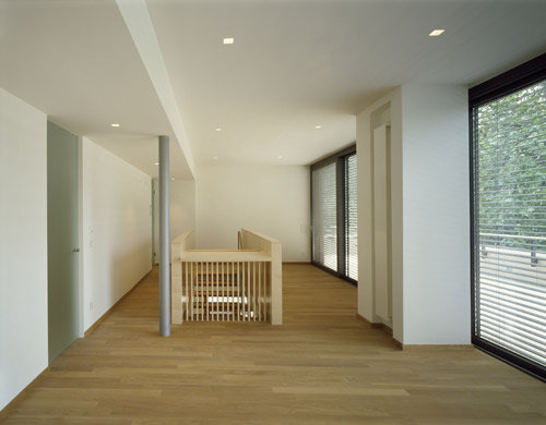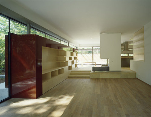 Das Einfamilienhaus, das mit insgesamt 500 m² Nutzfläche räumliche Großzügigkeit gewissermaßen spielend garantiert, verfügt über ein ausgebautes Kellergeschoss, in dem nicht nur die Haustechnik und die Wirtschaftsräume untergebracht sind, sondern auch ein Gästebereich, der durch geschickte Belichtung jeder kellerhaften Düsternis entbehrt. Die beiden Wohngeschosse mit den Familienräumen unten und den Arbeits- und Schlafräumen oben sind durch große Verglasungen an den schönen Gartenraum angebunden, wobei die als Deckenuntersicht im Inneren weitergeführte Gebäudehaut (sandfarbene Betonplatten) die Verzahnung von Innen und Außen zusätzlich betont. Das Staffelgeschoss mit großer Sonnenterrasse, Sauna und Fitnessraum verschafft der körperlichen Ertüchtigung und der „Wellness“ einen außergewöhnlich luxuriösen Rahmen. Die Zeiten, in denen der Hometrainer verschämt im Keller oder einer Ecke des Schlafzimmers stand, scheinen wohl endgültig der Vergangenheit anzugehören. (Text: Gabriele Kaiser)