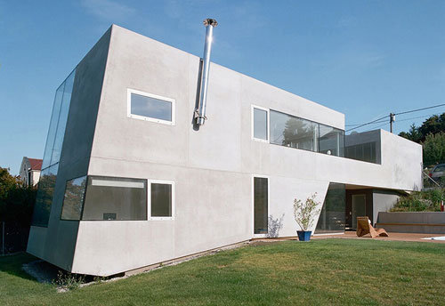 Bei aller Leichtigkeit steckt hinter all dem viel Berechnung und Logistik. In Wahrheit ist Haus P. nämlich keine Skulptur, sondern ein aus Fertigbetonteilen in Sandwich-Bauweise zusammengesetztes Haus. „In der Planung ist das ein sehr aufwändiges System“, erklärt Architekt Günther Katherl. Auch die Installation und Verkabelung musste bereits im Vorhinein exakt berücksichtigt werden. Dank dieser Überlegungen kann das ganze Haus von einem zentralen Technikraum aus über acht Boxen mit chilligen Klängen beschallt werden. Spätestens dann rockt der Fisch durch die Landschaft.