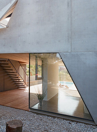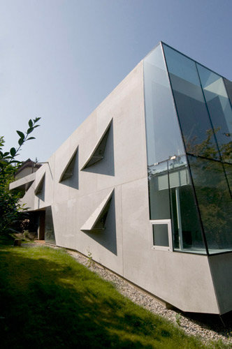 Da das Haus nahe am Nachbargrundstück steht, haben sich die Architekten entlang der Ostseite dreieckige Glasflächen ausgedacht. Von außen sehen diese Öffnungen wie Kiemen aus, die das Haus mit Licht und Sauerstoff versorgen, gleichzeitig jedoch vor Blicken schützen - eine Idee, die im Bauprozess lange diskutiert wurde.