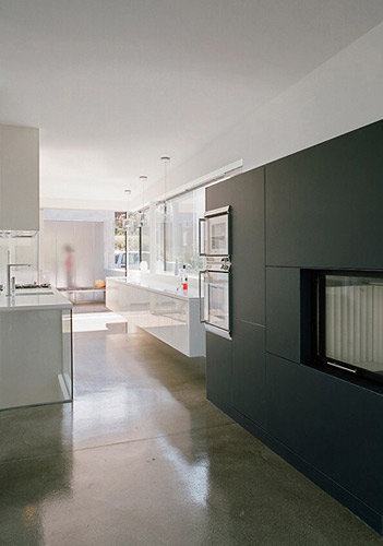 Die Sichtbetonwände sind weiß gestrichen, die geradlinige Küchenzeile ist ebenfalls in Weiß gehalten, ein anthrazitfarbener Geräteblock mit integrierter Feuerstelle erfreut das Auge. Die unregelmäßigen Grau- und Braunschattierungen des Fußbodens - geschliffener Estrich, der mit Kunstharz versiegelt wurde - geben den Wohnräumen im ganzen Haus eine natürliche Grundlage.