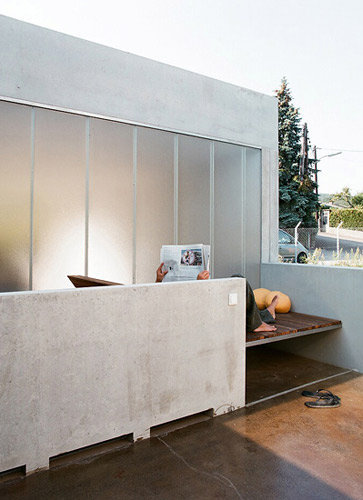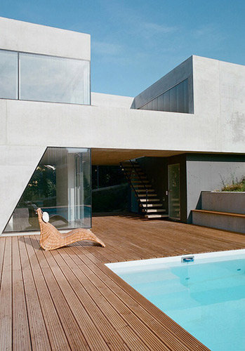 Will man das Bild vom geschuppten Meeresbewohner beibehalten, so betritt man den lang gestreckten Bau über die Schwanzflosse. Was bei den Fischen als Hauptantriebsorgan dient, ist hier der Sitz der Garage. Über eine offene Terrasse, die auf drei Seiten geschützt und nach oben hin offen ist, gelangt man direkt in den Rumpf: in den 150 Quadratmeter großen Wohnbereich auf zwei Ebenen.