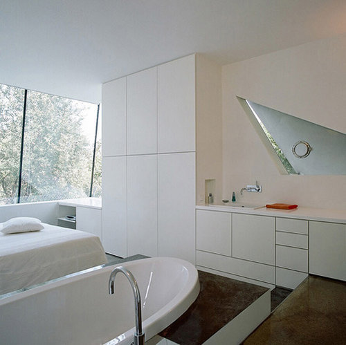 Im Gartengeschoß sind alle herkömmlichen Gebäudeecken einer Eckverglasung gewichen, was das Haus größer und offen erscheinen lässt. Ziemlich ungewöhnlich ist die Kombination aus Schlaf- und Badezimmer: „Das ist fein“, sagt der Bauherr, „man kann in der Badewanne liegen und fernsehen und hat es nicht weit ins Bett.“ Vom Atelier, das derzeit von drei Katzen bewohnt wird, gibt es einen Ausgang auf die Terrasse. Vom Gang geht es direkt in den Garten.