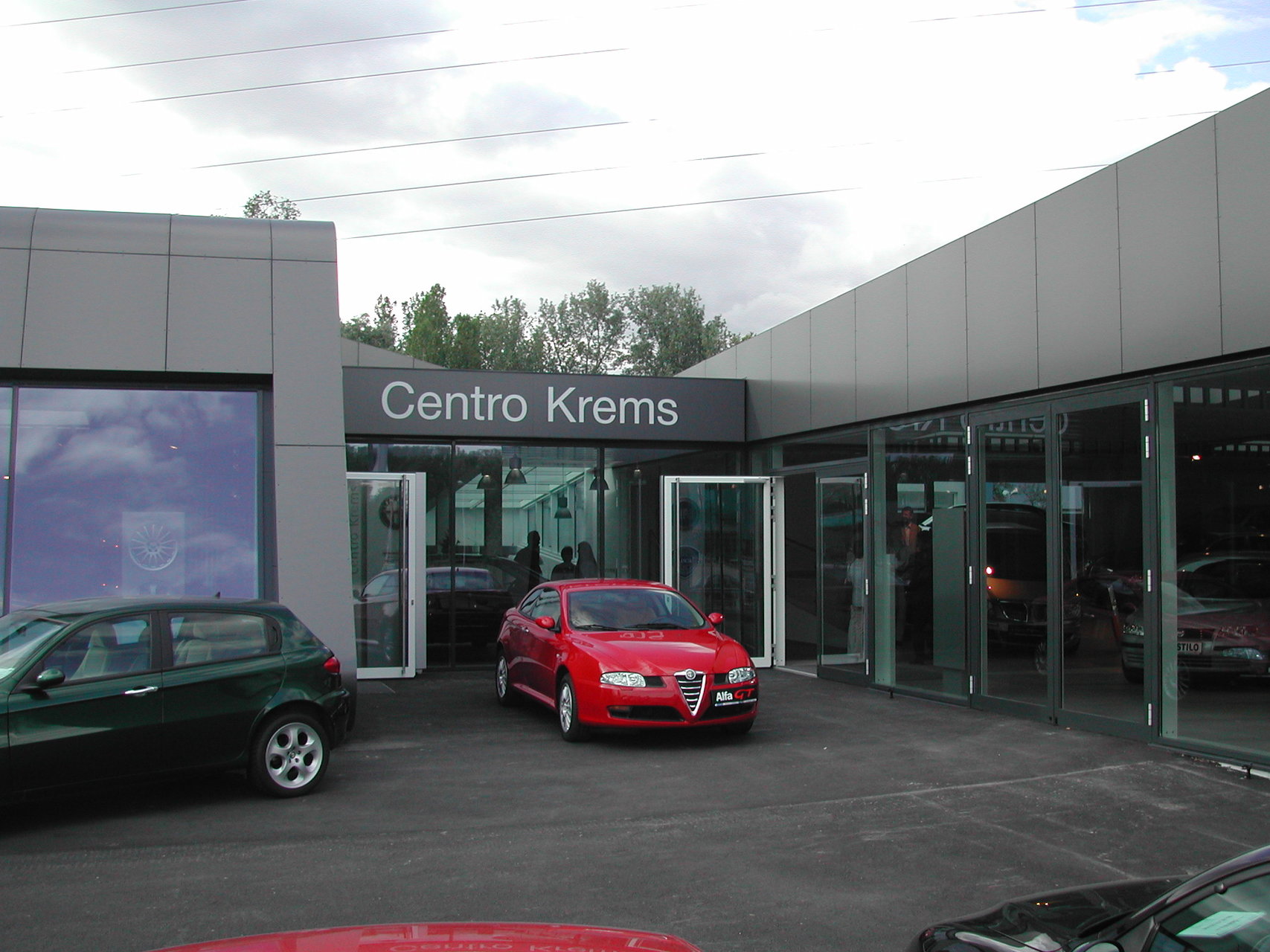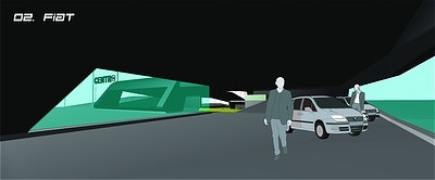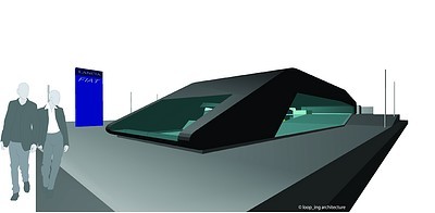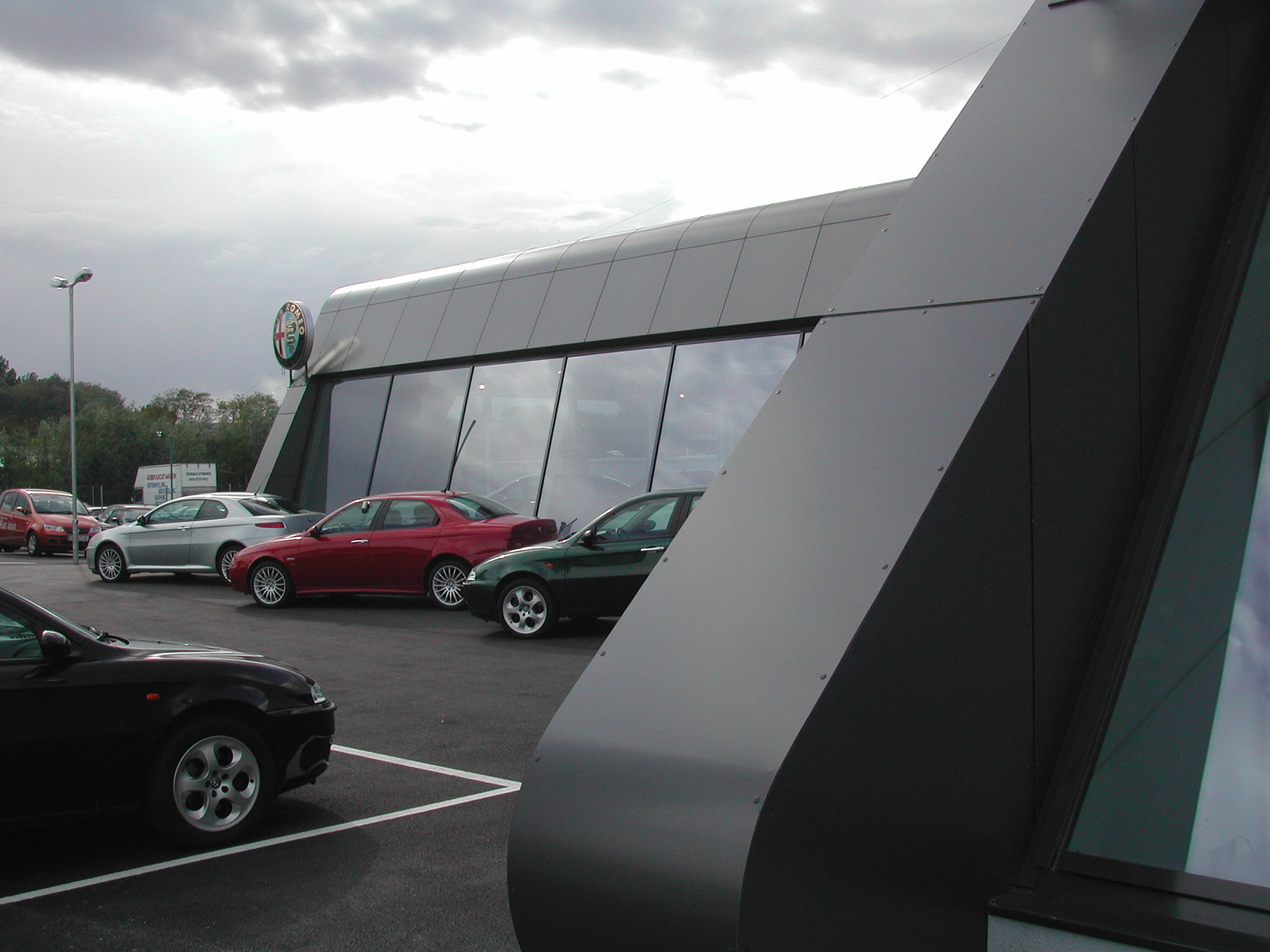 Durch die geschickte Ausnutzung und Verstärkung der topographischen Verhältnisse werden der rückwärtige Werkstättenbetrieb und die Lagergebäude mit dem abfallenden Geländeverlauf mitgeführt und verschwinden in der Frontalansicht von der Straße hinter den repräsentativen Schauräumen. Die Schauräume erhalten zur Straße eine stark geneigt Glasfassade mit einer futuristischen Anmutung.