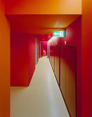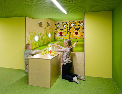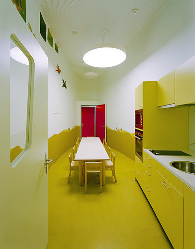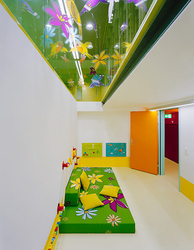 Vom Oberlicht fällt weiches Licht in den Ruheraum hinunter, der für ein Schläfchen der Kleinsten oder ihrem Aufenthalt dient. Hier finden sich Wandspiele mit sinnlich-sensorischen Lerneffekten. Der Pausenraum erhebt sich als frei geformter Turm wie ein Ruhepol innerhalb der bewegten Umgebung. Sein Äußeres wird vom Bild einer Akazie geprägt. Hier gibt es die kleine Erfrischung zwischendurch oder Raum für eine private Kindergeburtstagsfeier. (gekürzter Text der Architektinnen)