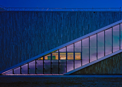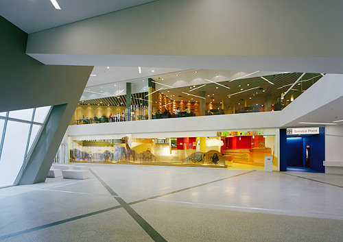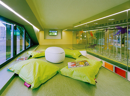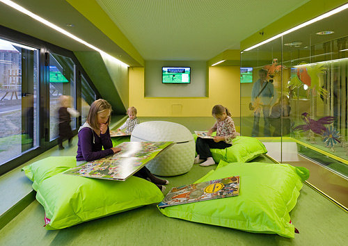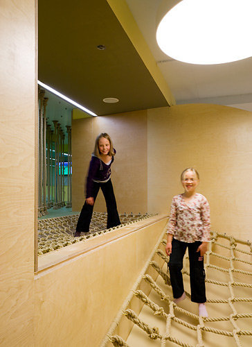 Innerhalb der Kletterterrasse gilt es, einen Ballpool zu durchqueren, eine Kletterwand zu besteigen, einen Krokodilsgraben mittels einer Seilbrücke zu überqueren, um über ein Kletternetz schließlich über den nach unten offenen Gang auf die sichere Galerie zu gelangen, um nach Bezwingen des Seillabyrinths über die große Rutsche in die Tiefe zu sausen. Ganz oben auf der Galerie, in einem gläsernen Oberlicht drehen sich windbewegte Vogel- und Blütensilhouetten. Das Oberlicht trennt das Seil-Labyrinth und den Einstieg der großen Rutsche vom Lesebereich der Galerie, der über ein breites Fensterband Tageslicht empfängt. Hier in der grünen Oase schmökern die Leseratten wie in einer Baumkrone.