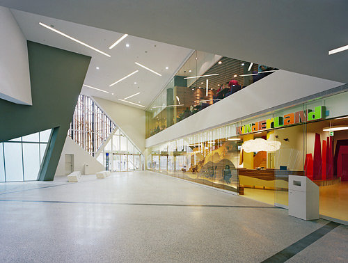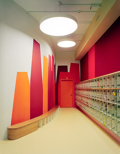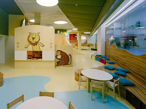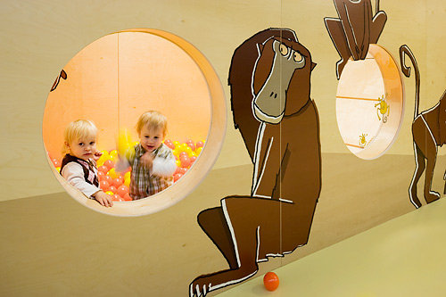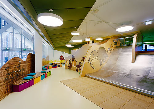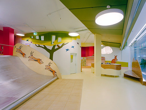 Auch die Farbwelten des Kinderlands sind an diesen Lebensräumen orientiert. Ein weicher Sandton kennzeichnet den Fußboden, ein weiß-helles Blau fasst die Deckenflächen zusammen. Sonnenuntergangsfarben des australischen Outbacks und amerikanischer Canyons empfangen im Garderobenbereich. Die Galerie mit dem Lesebereich erleben die Kinder wie ein grünes, lichtes Nest in den Baumkronen. Wer den Versorgungsgang zu Spielmaterial und Nassräumen betritt, taucht ebenfalls in ein kräftiges, dieses Mal rotes Farbbad ein. Das Kinderland entfaltet sich hinter der markant furnierten Silhouette einer Tierkarawane, die als Attraktion und Sichtschutz zur Mall dient. Es gliedert sich in einen Hauptraum beginnend mit Empfang und Garderobe, den großen Rutschenhügel, der über eine Treppe oder die Kletterterrasse erklommen wird. Zur einen Seite schließt der Hauptraum mit dem Bastelbereich ab, der als langgezogene Sitzbank mit einer weich fließenden Uferkante ein himmelblaues „Wasserloch“ umgibt.