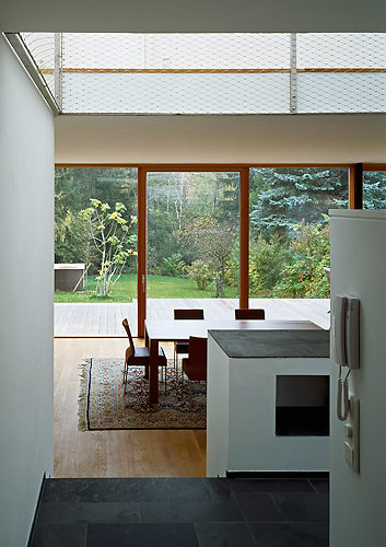 Prompt bekam die Nordseite des Hauses, die sich zum Garten und zum Wald hin orientiert, eine Glasfassade verpasst, während die südseitige Straßenseite bis auf ein Lichtband zur Gänze geschlossen wurde. Eine ungewöhnliche Lösung. Betritt man jedoch das Gebäude, wird man angenehm überrascht: Der Raum ist nicht nur großzügig und offen, sondern auch erstaunlich hell.