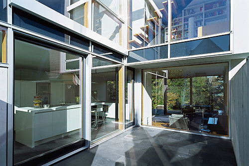 „Noch vor Planungsbeginn haben wir die Bauherrn gebeten, die Sonne auf dem Grundstück genau zu beobachten“, sagt Gharakhanzadeh. „Wir wollten wissen, wann und wo das Licht auf den Bauplatz fällt.“ Diese haben die Aufgabe offenbar ernst genommen. Die Architekten ließen die Daten in ihren Entwurf einfließen und legten in der Mitte des Hauses einen Patio an, der den Kochbereich nach außen erweitert und an die Höfe persischer Häuser erinnert. „Der Patio speichert die Wärme und kann daher länger, als es das Klima in unseren Breitengraden erlaubt, benützt werden.“ Kein Wunder, dass dies einer der Lieblingsplätze der Familie wurde.