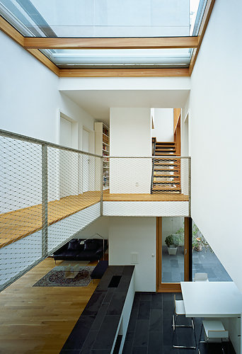 Die Mitte des Hauses ist in mehrfacher Hinsicht interessant: Sie ist als zweigeschoßiger Luftraum mit Galerie konzipiert und verleiht dem Haus eine beschwingte Leichtigkeit. Licht und Sonne werden auf diese Weise eingefangen und im ganzen Haus verteilt. Der dunkle Schieferboden gibt als Kontrast zu den weißen Wänden Halt und Festigkeit. „Der zentrale Ofen kann mehr als Feuer zeigen“, erklärt die Architektin - was er bei einem Heizungsausfall bereits unter Beweis stellen konnte.