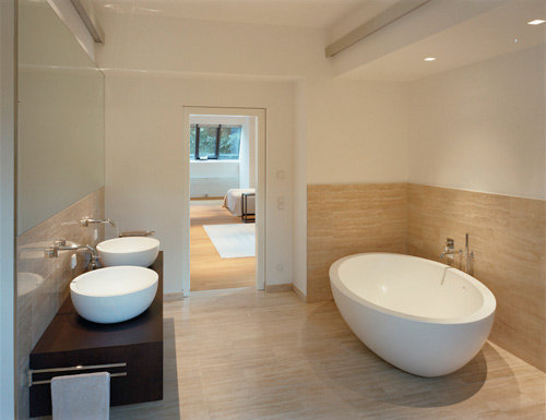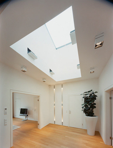 Im Dachgeschoss befinden sich Rückzugs- und Privaträume. Bei einer Raumhöhe von 314 cm lässt es sich selbst im Dachgeschoss mit den leichten Schrägen, die durch das Walmdach entstehen, großzügig leben. Ein zentraler Atriumsraum bietet natürliche Belichtung von oben. Die Außenanlagen wurden in sorgfältiger Abstimmung mit Haus und Situierung auf dem Grundstück sowie dem Wunsch nach Lärchenholz-Sonnendeck, Swimmingpool und großzügiger Terrasse abgestimmt. (Text: Eva Trimmel)