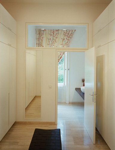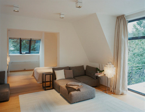 Im Dachbereich wurde besondere Behutsamkeit an den Tag gelegt. Weil das Gebäude sich in einer Schutzzone befindet, war es unumgänglich, dass etwa die großzügig angelegten Dachflächenfenster nicht wie die üblichen aufgeklebt wirkenden Kästen aus der Dachhaut herausragen, sondern bündig mit jener abschließen. Durch die gut abgestimmte Farbgebung der Aluminiumrahmen verschmelzen sie wie aus einem Guss mit dem restlichen Dach. Trotz zum Teil radikaler Eingriffe in die Bausubstanz wurde bei der Modernisierung äußerste Sensibilität an den Tag gelegt. Dem Erdgeschoss/Souterrain wurde die Pizzeria „ausgetrieben“ und Gästezimmer, sowie Büro- und Besprechungsräumlichkeiten angeordnet. Durch die Anhebung des Bodenniveaus sowie den Einbau einer Fußbodenheizung im gesamten Geschoss wurde erreicht, dass kein einziger dieser Räume Assoziationen mit einem „Keller“ weckt, obwohl das Geschoss bis zu 1 m Höhe im Erdreich steckt.