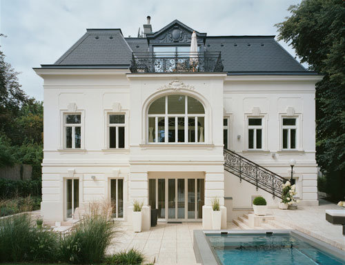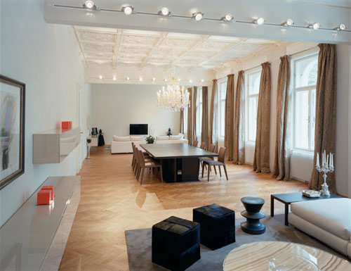 Auf der Beletage befinden sich die Repräsentationsräume, bei denen mit Quadratmetern nicht geknausert wurde. Dieses Geschoss wurde in beinahe archäologischer Arbeitsweise wieder freigelegt. Wandverkleidungen wurden entfernt, Dispersionsfarbe Schicht für Schicht abgetragen. Die ehemals verschachtelte Raumfolge musste einer klaren, großzügigen Orientierung rund um einen zentralen Vorraum weichen. Highlight ist hier neben dem 90 m² großen Salon ein offener Kamin, der so in die Wand zwischen Vorraum und Bibliothek eingebaut wurde, dass er einen Durchblick gewährt und dadurch an beide Seiten warmes Licht sowie wohlige Wärme abgibt.