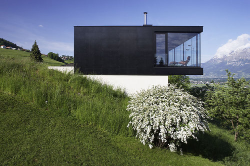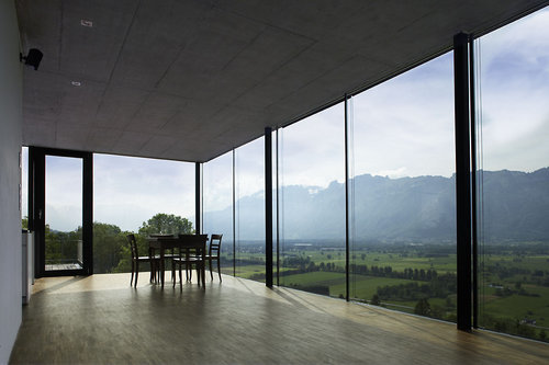 Die weite Aussicht ins Rheintal sowie auf die reizvolle Hügellandschaft des Schellenbergs im Hintergrund bilden ein reizvolles Szenario. Der Baukörper wird direkt an die Hangkante gerückt. Darüber schwebt ein luftig draufgesetzter und leicht auskragender Pavillon. Das Haus erscheint dadurch zierlich und klein. Die eben begehbare Terrasse jedoch zeichnet die stattliche Grundfläche des teilweise eingegrabenen Erdgeschoßes nach. Talseitig gehen die Holzlatten in die Horizontlinien über, auf der anderen Seite verbinden sie sich nahtlos mit der Wiese.