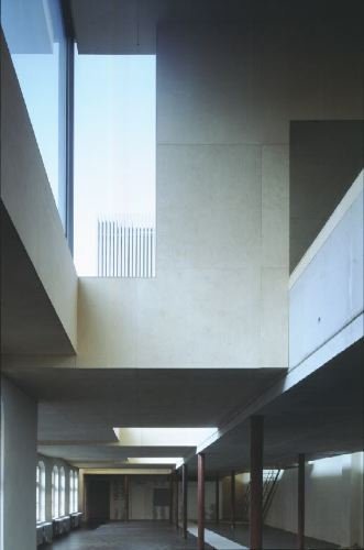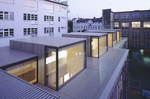 Das Dach wurde mehrschichtig mit einer filigranen Außenhaut aus Aluminium Hohlprofilen ausgebildet. Die Profile sind in vier unterschiedlichen Farben beschichtet, die über die Flächen unregelmäßig verteilt sind. Die Farben sind den vorhandenen Mauerziegeln entlehnt, die den gesamten Hof prägen. Die Anlehnung an die Farbe der Mauerziegel trägt ebenso zur Integration der neuen Gebäudeteile bei wie deren Ausbildung im Detail, die sich die Feinheiten der Ziegelkonstruktionen zum Vorbild nimmt. (nach einem Text der Architekten)