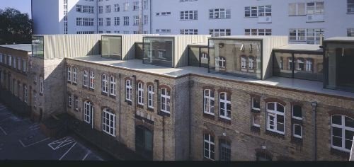 Neben der Vergrößerung der vermietbaren Fläche und einer besseren Belichtung des Gebäudes stand der Wunsch nach einer Qualifizierung der Dachaufsicht im Vordergrund, um die Aussicht aus den umliegenden, höheren Stockwerksfabriken zu verbessern. Aus diesen Anforderungen entstand die Idee, das Dach als Fassade zu planen und mit großen Lichtöffnungen zu versehen.