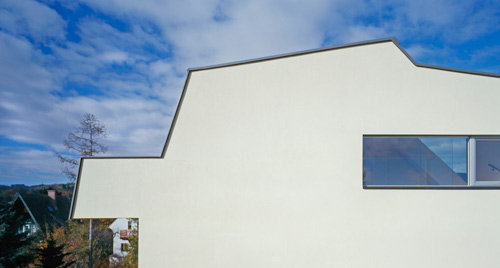 „Jedes Projekt ist ein Prototyp, das für die Bauherren ein Optimum an Größe, Komfort und Qualität herausschlägt“, sagen die Architekten, „das Tollste an der Lage sind die vielen Ausblicke, die man von hier oben hat. Von Anfang an war daher klar, dass wir das Panorama ins Haus holen müssen.“ Die neue Aufstockung sollte nicht wie ein Fremdkörper am Haus sitzen, sondern wie aus einem Guss erscheinen. Bis die endgültige Form gefunden war, wurden unzählige Modelle gebaut, Dachneigungen erprobt, Gaupen hochgeklappt, Fenster eingeschnitten, Terrassen eingekerbt. Das Endresultat ist ein abstrakter Monolith, der von einer dünnen Haut überzogen ist.