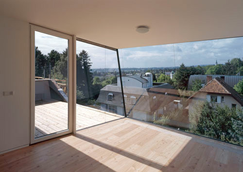 Im Bereich der Terrasse mussten die Architekten tricksen: Damit der Holzleichtbau über den Balkon im Südwesten auskragen und seine Schnauze der Sonne entgegenstrecken kann, musste die alte Decke mittels Stahlträgern verstärkt werden. Wie von einem Cockpit aus blickt die Baufrau über Grinzing: „Besser könnte es nicht sein.“