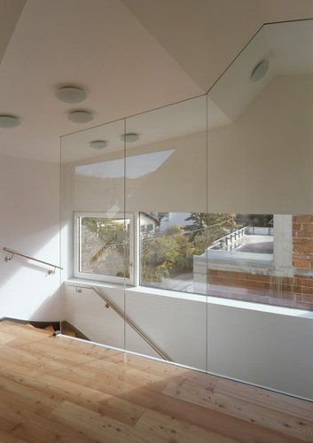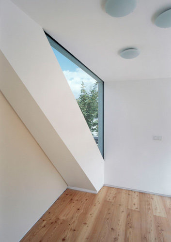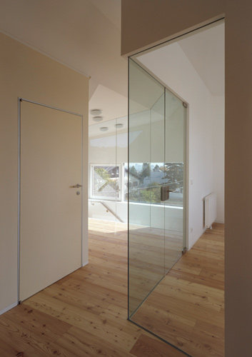 Die transparente Intention der Bauherren und Architekten ist dem Dachaufbau deutlich anzusehen. Mit einem imposanten Nurglaseck stülpt sich das Home-Office auf die offene Gangmitte. Unmittelbar vor dem Panoramaglas steht der Schreibtisch des Bauherrn. Über eine große Schiebetür kann man auf die Terrasse treten, die genau zwischen den Arbeitsterritorien von Mann und Frau liegt. Auf diese Weise kann man einander im Blickfeld behalten.