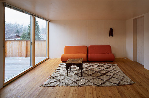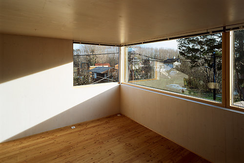 Die neue Fassade aus unbehandeltem Holz soll sich im Lauf der Zeit mit zunehmender Patina dem bestehenden, rot lackierten und nun als Sockel wirkenden Geschoss annähern. (Text: Marion Kuzmany)