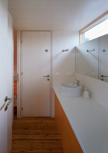 In Anbetracht der Einfachheit der umgebenden Siedlungshäuser und des Bestandsobjektes sowie aufgrund gesetzlicher Parameter – das Kleingartengesetz und die Regelung des sommerlichen Bauverbots innerhalb der Siedlung – wurde ein rasch umsetzbares Fertigteilsystem und eine simple, auf die Donaustrandästhetik des frühen 20. Jahrhunderts eingehende Architektursprache für den Neubau gewählt.
