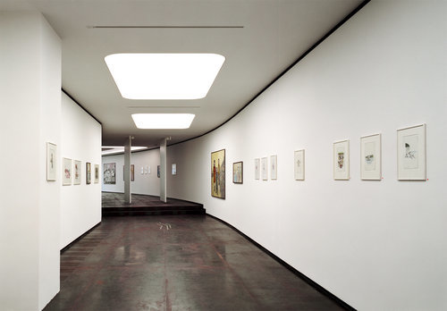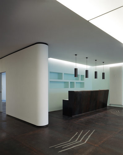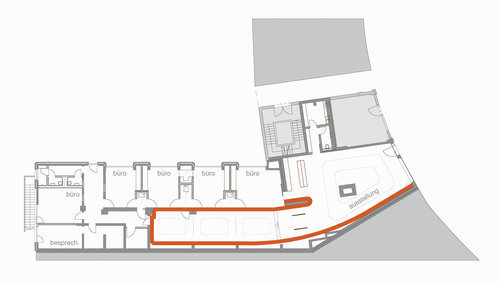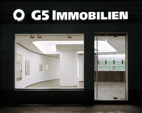 Der raumbildende Ausbau vereint nun Büroräume für ein Projektentwicklungs- und Immobilienbüro sowie einen Multifunktionsraum für Präsentationen und Kunstausstellungen. Das Konzept der bandartigen Ausstellungswand ordnet und definiert die unterschiedlichen Funktionsbereiche, umschließt den Ausstellungsbereich und verbindet zugleich die ehemals unstrukturierte Raumabfolge zu einem einheitlichen Raumkontinuum. Die Exponate können sich im Raum entfalten, Kunst und Architektur werden eins. (nach einem Text der Architekten)