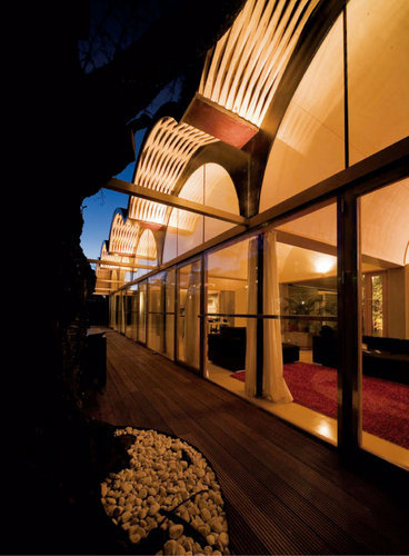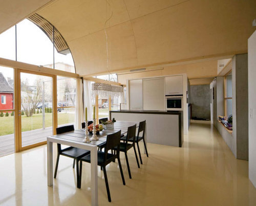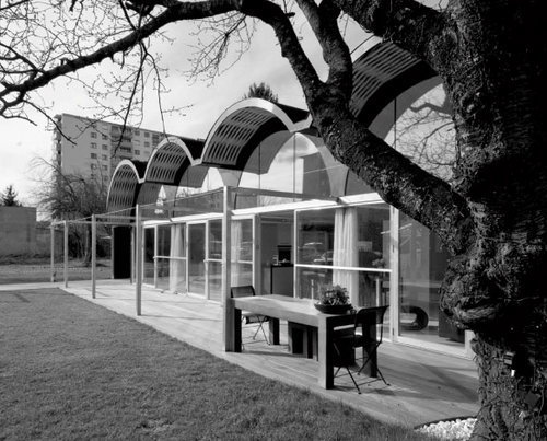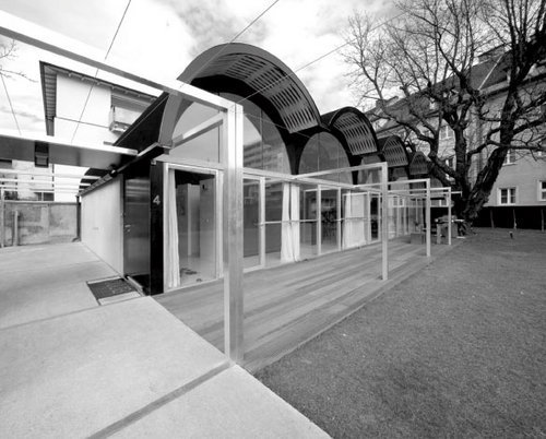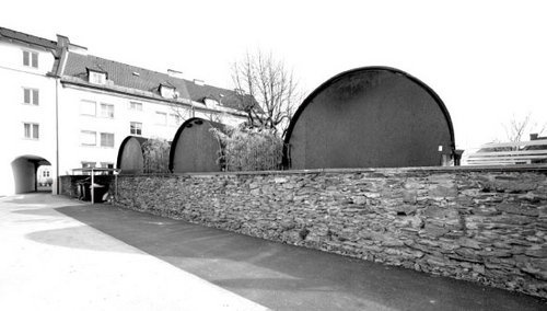 Wie wir das Grundstück vorfinden - als Reststück der Vergangenheit - entwickelt sich die Hausform. Die Tonnengewölbe reihen sich aneinander wie Unterstände für Postkutschen - oder so - aufliegend auf der alten Mauer. Drei lange, zwei kurze. Zwei kleine Höfe mit der Mauer einschließend. (Text: Architekt)
