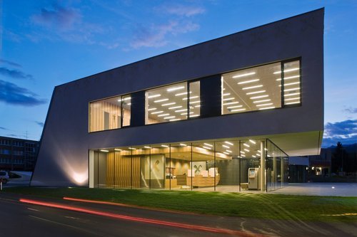 Das Erdgeschoss ist offen und transparent gestaltet und schafft Verbindungen zum neuen ‚Marktplatz’ im Süden als auch zum westlich gelegenen Haupteingang der Fa.Pacher. Wichtig ist die Anbindung nach Süden und ein Öffnen des Gebäudes im Erdgeschoss, um eine städtebauliche Achse zwischen dem oberen Hauptplatz und dem neu entstehenden Platz zwischen Raika und Post/Wohnhaus herzustellen. Dieser Platz erhält dadurch die Kapazität, neue attraktive Geschäftsstellen zu erschließen und wird zum neuen ‚Marktplatz’.