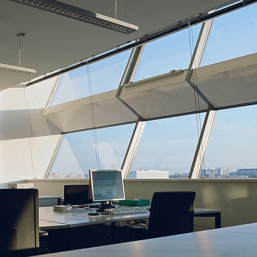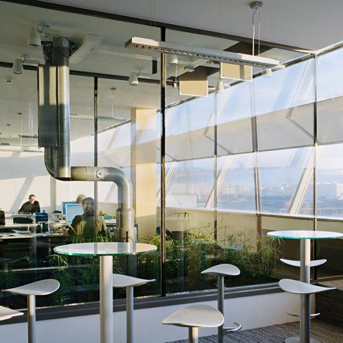 An der Nordseite reihen sich, komplementär zu den weitläufigen Raumeinheiten an der Südseite, Zellenbüros, Nebenräume und Gangbereich liegen offen an der Südzone und sind im gesamten Jahresverlauf lichtdurchströmt. In herkömmlichen Bürobauten müssen ca. 40 Prozent der Nutzfläche künstlich belichtet werden, was in der Energiebilanz natürlich negativ zu Buche schlägt. Mit einem Heizenergiebedarf von nur knapp über 13 kwh/m2.a liegt die Energy-Base merklich unter dem Schwellenwert für Passivhäuser (15 kwh/m2.a). Die gebäudeintegrierte rund 400 qm große Photovoltaikanlage an der Südfassade liefert jährlich rund 37.000 kwh Solarstrom. Für die Frischluftkühlung kam die innovative Technologie des „solar cooling“ bzw. eine Dec-Anlage zum Einsatz, die über solarthermische Kollektoren (285 m² an der Südfassade) gesteuert wird, die im Winter zusätzlich heizungsunterstützend wirkt. Für die Beheizung des Gebäudes wurde eine Grundwasser-Wärme-Pumpe installiert, die Verteilung der so gewonnenen Wärme erfolgt über die in den Stahlbetondecken geführten Kunststoffrohre (Bauteilaktivierung). Ein absolutes Novum in Österreich ist auch die Nutzung von Pflanzen zur natürlichen Befeuchtung der Raumluft in den Wintermonaten. Über präzis steuerbare viergeschossige Pflanzenpufferräume mit 500 Setzlingen einer speziellen Art des Zyperngrases wird Feuchtigkeit ins haustechnische System gespeist und Schadstoffe aus der Luft gefiltert. Zum behaglichen Raumklima gesellt sich zudem der nette Anblick, den diese „arbeitenden“ Pflanzen bieten. Bekanntlich hängt der Energieverbrauch in energieeffizienten Gebäuden stark vom Nutzerverhalten ab. Energy-base setzt daher auf eine umfassende Nutzerinformation und hat in der Eingangshalle eine Informationsstele mit aktuellen Gebäudedaten und Nutzerempfehlungen aufgestellt. Intelligente Architektur mit Gebrauchsanweisung. (Text: Gabriele Kaiser)