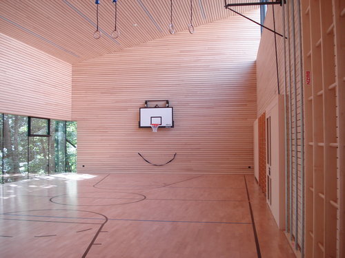 Bei der Eröffnung im Herbst 1962 machten die rundum holzverkleideten Klassenräume und deren beidseitige Versorgung mit Tageslicht Furore. Die Positionierung der Fenster in kindgerechter Augenhöhe wurde ebenso bestaunt wie die großzügige Aula und die breiten Korridore. Eine absolute Neuheit aber war der südseitig verglaste Gymnastiksaal am Ende des Ostflügels. Zwar wurde die Schule in Mischbauweise ausgeführt, ihre Gesamterscheinung wird jedoch innen wie außen von Holzbauteilen dominiert: von den in Ständerbauweise ausgeführten Nord- und Südwänden, der sichtbaren Holzkonstruktion mit den großflächigen Verglasungen im Aulabereich und den mächtigen Leimbindern der Dachstruktur. Handwerklich kamen durchwegs solide, einfache Techniken zum Einsatz. Dennoch stellte der Bau in dieser Hinsicht eine Herausforderung dar.
