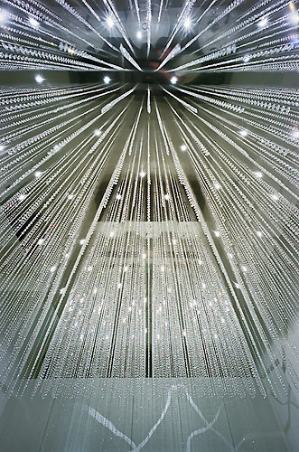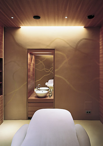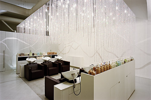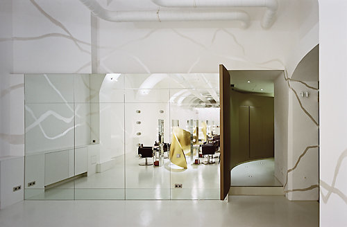 Der Bereich, in dem die Haare gewaschen werden, ist durch ein Lichtelement gekennzeichnet. Glitzernde Kristalle über den Waschplätzen sind eine willkommene Abwechslung zum für gewöhnlich monotonen Blick auf die Decke während der Kopf gewaschen wird. Dem Salon angeschlossen ist ein Day-Spa-Bereich („Schönheitswerkstatt“), der zur Gänze in Holz gehalten ist. (Text: Martina Frühwirth, nach einem Text des Architekten)