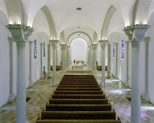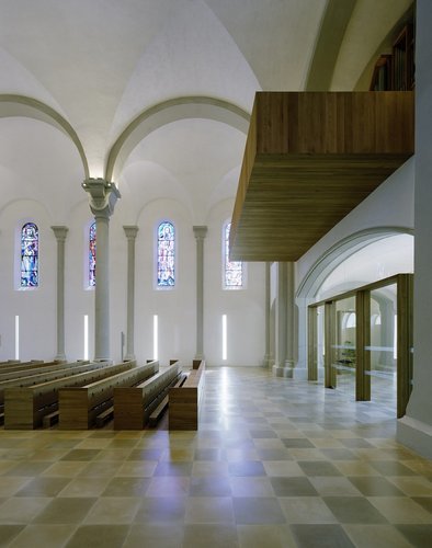 Der Solenhofer Bodenbelag, die Eichenblöcke, die Lichtscharten, die asymmetrisch unter den Fenstern platziert wurden, die wenigen hochqualitativen, subtilen Eingriffe verleihen der Kirche unprätentiös eine natürliche Noblesse. (Text: Vera Purtscher)
