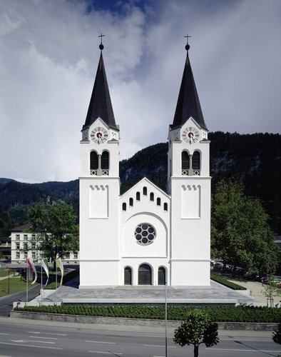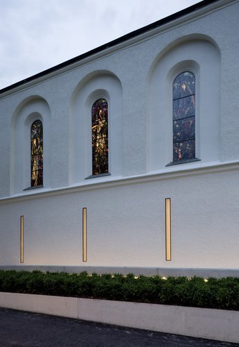 Der Außenraum wurde ins Konzept mit einbezogen. Die Kirche ruht nun auf einem ebenen Platz, der sich gegen die Straße deutlicher abhebt - auch dank scheinbar in der Nacht – schwebender, langgestreckter Betonbänke und einer Buchsbepflanzung, die später einen kubischen Grünraum bilden soll, ergänzt um eine traditionelle Linde. Breite Stufenanlagen machen das „Gottes- Podest“ erreichbar. Die äußere Erscheinung der Kirche wurde durch die Licht-Scharten kaum verändert, wirken sie doch zurückhaltend selbstverständlich.