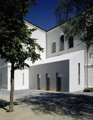 Zugebaut wurde an der alten Stelle der Sakristei eine neue, vollständig in Beton. Das Dach bildet so mit den zwei Außenwänden eine eigenständige Betonfigur mit 3 Glastüren zur Südseite und einem langen Fenster Ostseitig. Innen wurde der Bestandskirchenwand der Verputz abgeschlagen und eine entsprechend lebendige Natursteinmauer freigelegt, die im DG der Sakristei dem Jugend-Raum einen erdgebundenen Charakter verleiht.