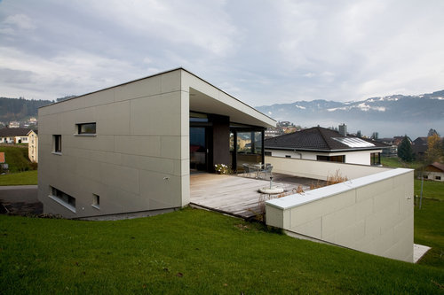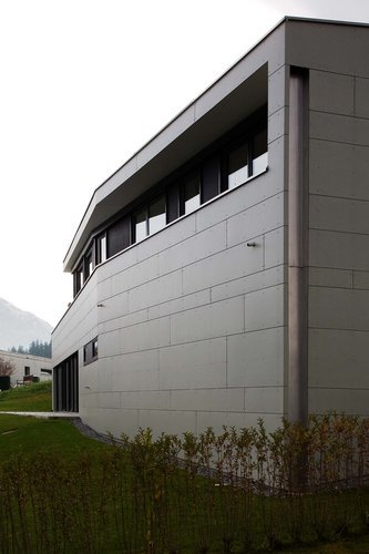 Mit Massivbauweise in der Konstruktion und grauer Eternitfassade ergibt sich ein dezentes Äußeres. Nur eine Dachrinne ist aufgrund der günstigen Neigungen des Baukörpers notwendig und diese ist auffallend am Eck zur Zufahrtsstraße als Wasserfall detailliert. (Text: Martina Pfeifer-Steiner)