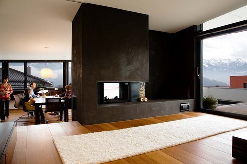 Die Holzdielen am Boden sind genau nach Maß abgelängt, nicht gestoßen und aus gelaugtem und geöltem Teak. Dieses Material zieht sich durch: Treppeneinbau, Schränke und Garderobe sind aus denselben Material. Nur im Wohnzimmer wird gezielt für geradlinige Möbel ein stark gemasertes Makassar Furnier verwendet. Beleuchtung ist grundsätzlich von vornherein mitgeplant und integriert. Gezielte Lichtpunkte sind an geeigneten Stellen, wie Esstisch eingesetzt. Die Raumfarbe ist durchgängig in einem leichten Ton, der mit „hell“ am nächsten definiert ist. Im Kontrast dazu sind die schwarzen Fenster.