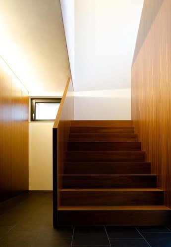 Konsequent zur Einform sind die Garagen integriert. Man betritt das Haus über den sich selbstverständlich ergebenden Vorplatz. Ein zweigeschossiges Entree leitet über das Treppenmöbel nach oben. Gezielte Fenster und Lichtdurchlässe machen das Treppenhaus zum Raum. Wohnen und Essen sind aufgrund des weiten Rundumblicks im Obergeschoß situiert. Eine Schiebetüre öffnet den großzügigen nach außen orientierten Raum. Es ist kaum zu unterscheiden, wo Innen aufhört und Draußen beginnt. Kochen, Wohnen, Essen und große Terrasse fließen ineinander. Über Treppen erreicht man das Wohnzimmer im eigentlichen Sinn. Ebenfalls oben befindet sich der Elterntrakt, der bewusst als eigener Bauteil über den Garagen gelegen, separiert ist. Der Kinderbereich wird ebenerdig über das Eingangsentree erreicht. Heute schon ist dieser Teil eine eigene kleine Wohneinheit.