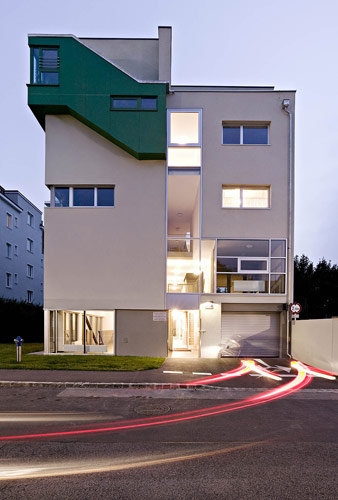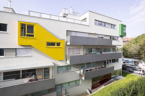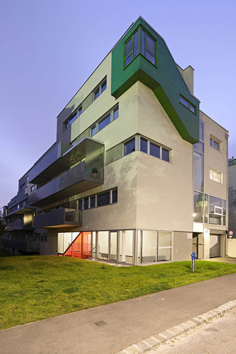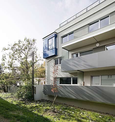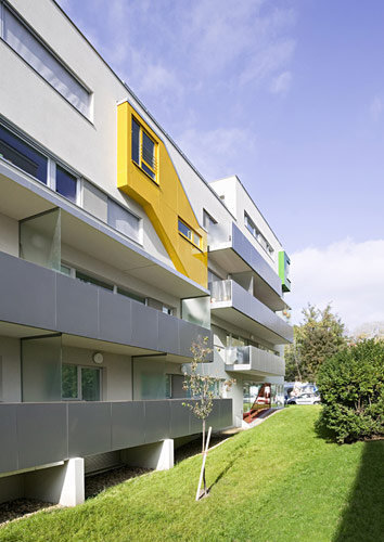 Das verglaste Stiegenhaus an der der Nordseite stellt zur Rautenkranzgasse eine Verbindung her. Die Nähe zur Alten Donau wird aktiviert: „Der Grünbereich des nördlichen Parks setzt sich entlang eines durchgängigen Grünstreifens mit Fußweg Richtung Süden zur Alten Donau hin fort“, berichten die Architekten. Das Grundstück weist eine Geländekante auf (ehemaliges Bachbett), die es ermöglichte, die höhenversetzten erdgeschossigen Wohnungen vor direkten Einblicken zu schützen. Der Stahlbetonbau ist weiß verputzt, die Brüstungen und Stiegeneinkleidungen wurden aus pulverbeschichtetem Aluminium gefertigt. (Text: Gabriele Kaiser)