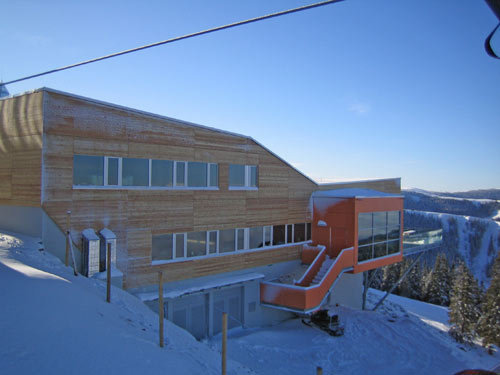 Die Gebäude der Tal- und Bergstation stehen in Konstruktion und Materialität im Kontext. Erdberührende Bauteile wurden in Stahlbeton, auskragende und darüber liegende Baukörper in Stahl- und Holzmischbauweise (Fertigteilelemente) errichtet. Die Fassadenverkleidung der Talstation besteht aus Trapezblech, in der Bergstation kommen Lärchen-Holzbauplatten zum Einsatz.