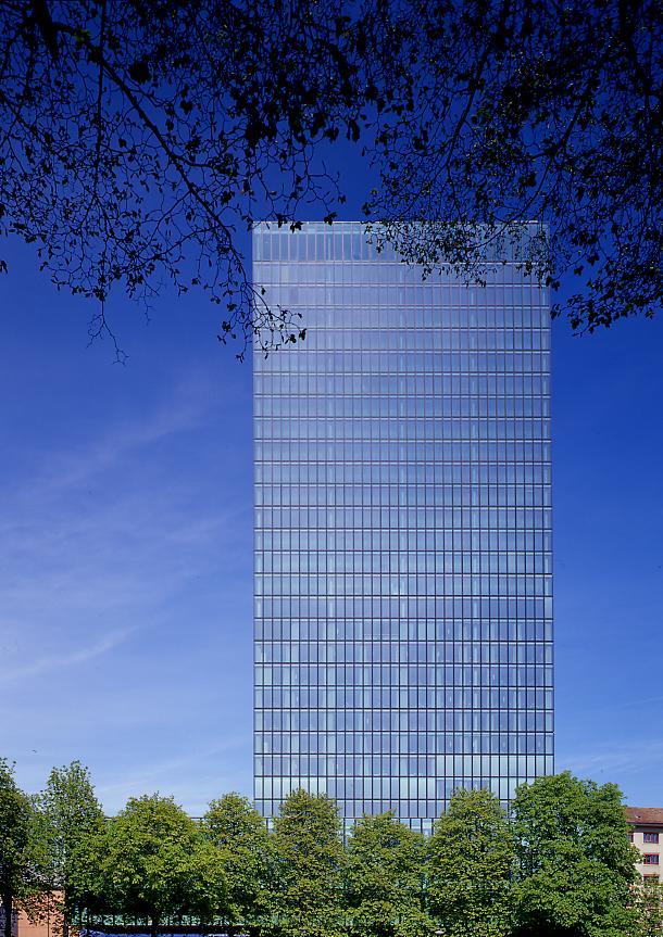 Die Auskragung will mehr sein als eine ingenieurtechnische Glanzleistung. Sie garantiert die Einbindung der Messe ins Stadtbild. Vom Badischen Bahnhof und vom Zentrum Kleinbasels aus gesehen, schiebt sich dieses auffällige architektonische Element in die Sichtachse und perspektiviert den Blick. Ein bisher zusammenhangsloser Stadtraum erhält seine optische Fassung. Darüber hinaus gelingt es Morger & Degelo und Marques scheinbar beiläufig, dem in allen Varianten vertrauten Typus Hochhaus ironisch eine neue Dimension abzugewinnen: Denn die Architekten folgen mit ihrem abstrakten Glasturm zwar dem seit Gordon Bunshafts New Yorker Lever House geläufigen und von Arne Jacobsen beim SAS- Hotel in Kopenhagen adaptierten Typus des Hochhauses über podiumsähnlichem Sockel, heben die horizontale Zone aber an und bringen sie in irritierender Weise zum Schweben. Internationale Hochhauskonzepte, die sich bald phallisch, bald prismatisch zersplittert geben und dann wieder von der Struktur einer Doppelhelix inspiriert sind, stossen in der Schweiz noch nicht auf Widerhall.