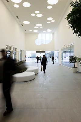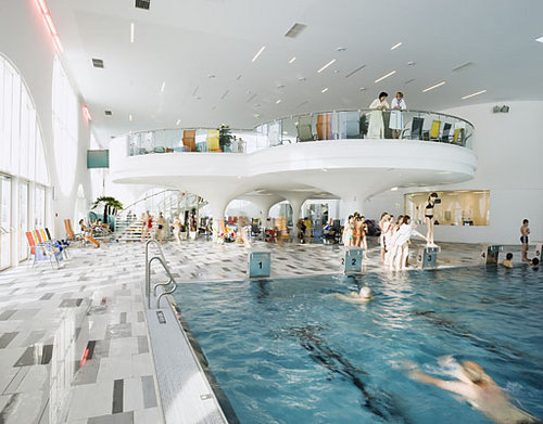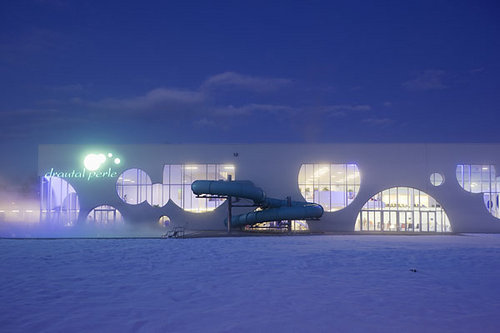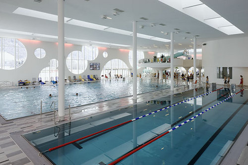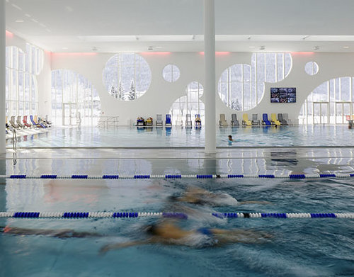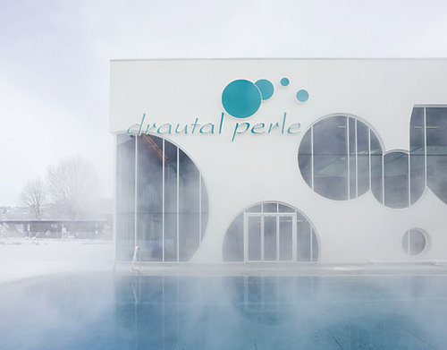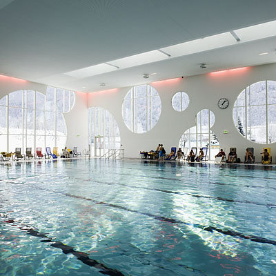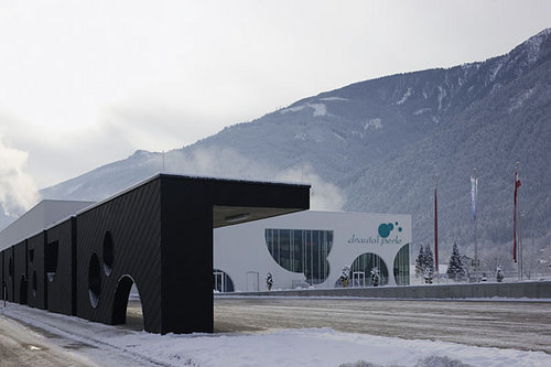 Der Innenraum bietet spektakuläre Ausblicke auf die Bergszenerie, das Drautal und die Drauauen. Licht und Schatten schaffen ein lebendiges Spiel der Oberflächen. Großer Wert wurde auf eine offene Atmosphäre sowie auf die Helligkeit der Gesamtanlage gelegt. Die Räume werden mit Licht durchflutet, etwa 700 m² des Baus sind reine Glasfläche. Innovative Kunstlichttechnik ergänzt die natürliche Beleuchtung. Dies erzeugt unterschiedliche Raumstimmungen, die auch an nebligen Wintertagen zum Baden einladen. Das komplett barrierefreie Hallenbad besitzt neben Sport- und Erlebnisschwimmbereichen ein großzügiges Wellness-Areal. Zusätzliches Highlight ist eine 65 Meter lange „Black-Hole“-Wasserrutsche. (Text: Architekt)