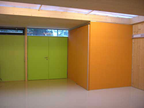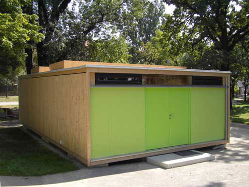 Das einfache leicht demontierbare (und auch lagerbare) Baukastensystem, welches eine auch schrittweise Erweiterung im Sinne des Achsensystems ermöglicht, kann beispielsweise mit einer Cafébar samt WC-Einheit ausgerüstet werden, die dem rund 43 qm großen Vereinsraum vorgelagert ist. Nicht nur Oberlichtbänder versorgen die Box mit ausreichend Tageslicht, sondern auch zwei Dachflächenfenster im über die Längsseite um rund 30 cm abfallenden Pultdach. An den farblich akzentuierten Schmalseiten der Box befinden sich mittig oder seitlich die jeweils über eine Betonstufe zu erreichenden und loggienartig geschützten Zugänge. Dass das kostengünstige System auch Gestaltungsspielraum birgt, zeigt eine Variante der „Jungen Box“, die für eine andere Nutzergruppe in Essling (ebenfalls Wien-Donaustadt) errichtet wurde (siehe gesonderten Eintrag). Text: Gabriele Kaiser