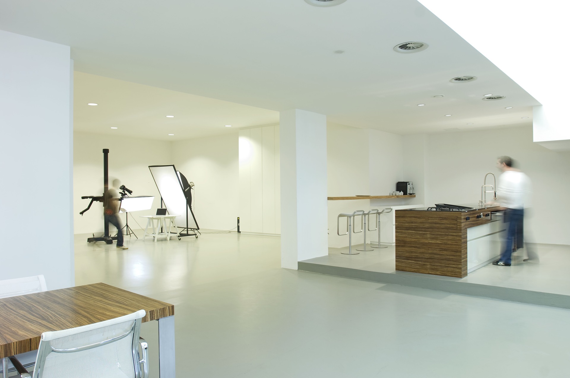 Der neutrale Hintergrund ermöglicht unterschiedliche Inszenierungen und Kulissenaufbauten. Das Lichtkonzept nimmt darauf Rücksicht. Da Food-Photography zu den Kernaufgaben der ms foto group zählt, nimmt die Küche einen zentralen Platz ein.