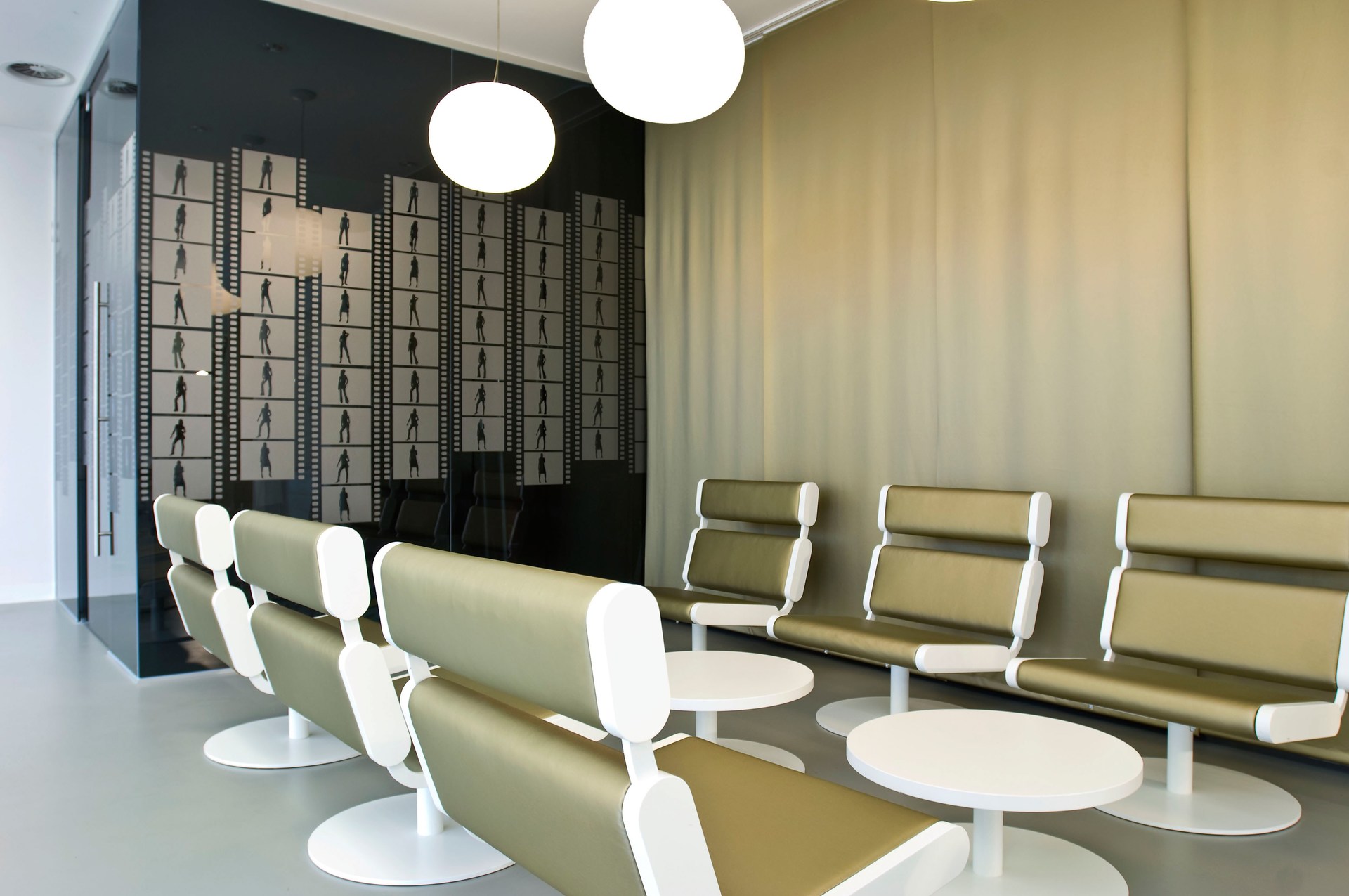 Aus akustischen und atmosphärischen Gründen sind die Büros und Bildbearbeitungsplätze mit schwarz gefärbten Glaswänden von der übrigen Fläche getrennt. Die Lounge, Herzstück des 300 Quadratmeter großen Studios, ist mit Möbeln ausgestattet, die eigens für diesen Zweck entwickelt wurden. Schwarz, Weiß und futuristisch anmutende Textilien in changierenden Goldfarben prägen das Ambiente. (Text: Architekten)