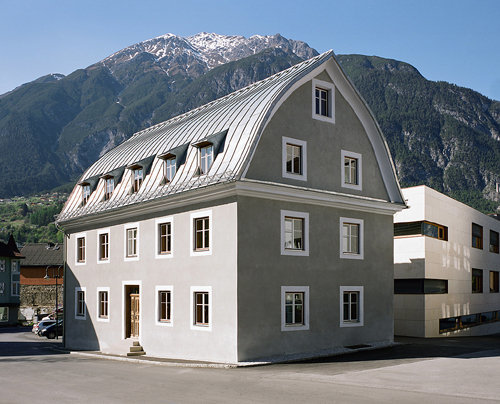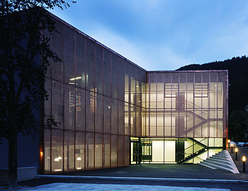 Das „Klösterle“, eine unterirdische Verbindungsspange und das Musikschulgebäude bilden eine dreiteilige, zusammenhängende architektonische Struktur, welche wie ein Gelenk, die fließenden Übergänge von drei Plätzen (Florianiplatz, Marktplatz, Hauptschulplatz) zu einem neuen Stadtzentrum verbindet. Die „Mitte“ dieses urbanen Gelenks ist das revitalisierte „Klösterle“, das seine charakteristische rechteckige Grundrissform zurückerhielt. Das Musikschulgebäude ist um vier Meter von der Nordfassade des „Klösterle“ abgesetzt, der Zwischenraum verstärkt dessen solitäre Position und eröffnet eine Fußverbindung zum Hauptschulplatz. Zum Marktplatz hin öffnet sich der Neubau in einer Glasfassade, eine vorgelagerte, semitransparente Schicht kupferner Streckmetalle fungiert als Sonnen- und Sichtschutz.