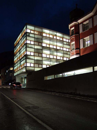 Der Umbau und die Erweiterung der Bezirkshauptmannschaft in Landeck zeigen einen gleichberechtigten Dialog zwischen Alt- und Neubau. Zurückhaltung, aber doch Präsenz sind die Prädikate des Neubaus im städtischen Umfeld. Horizontale Strukturen der Holzkonstruktion in Kombination mit einem transluzenten Glaskubus umhüllen das Gebäude. Die Lösung versprüht Eleganz. Die Tages- und Nachtlichtsituation spielt mit poetischen Ansätzen, die in klaren linearen Holzstrukturen eingebunden sind. Stützen und Horizontalverbindungen aus verleimtem, heimischen Lärchenholz bilden die Unterkonstruktion der Glasfassade. Durch die vorteilhaften bauphysikalischen Werte des Baumaterials Holz wurde auf die Dämmung der lastabtragenden Profile verzichtet. Das Projekt ist ein gelungenes Beispiel für Neubauten im städtischen Bestand. (Text: Jurytext)