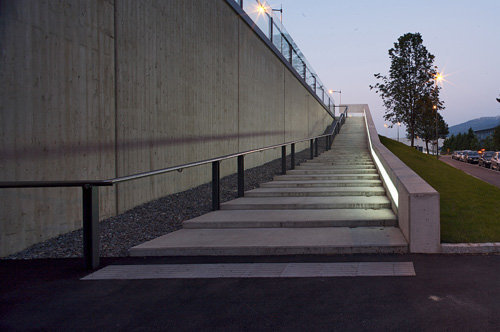 Im Osten löst sich ein großmaßstäblicher Sichtbetonträger vom Terrain und zeigt den Stiegenabgang an, der westseitige Brückenabschluss bleibt bis zum endgültigen Ausbau des Anschlusses Südbahnstraße und Kreuzung Leopoldstraße ein provisorischer. (Text: Architekt)