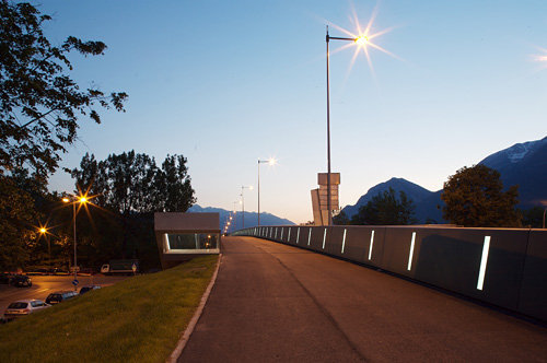 Die bündig in den Stahlträger eingelegten vertikalen Glasstreifen rhythmisieren elegant die homogen aus dem Brückenbelag wachsende Lichtwand. Südseitig lässt die gläserne Absturzsicherung den ungehinderten Blick über die Gleisanlage zum Stift Wilten, zur Bergisel-Schanze und in die Berge zu. Durch Vandalismus wurde eine „Schutzverkleidung“ notwendig, die als Trapezlochblechvorhang vorgehängt wurde.