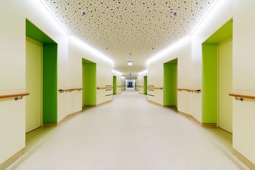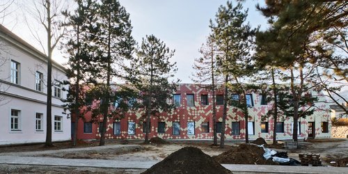 Der Zubau für das Pflegeheim in Hainburg ist ein kompakter Riegel, der durch seine Lage zum einen den denkmalgeschützten Altbau nur minimal über eine Glasfuge berührt, und zum anderen den wertvollen Baumbestand in der rückwärtigen Parkanlage weitestgehend erhält. Der Riegel ermöglicht zugleich unterschiedlichste Außenräume: Nach Osten umschließt er gemeinsam mit zwei Flügeln des Altbaus einen Hof mit geschützter Terrasse, nach Westen erfasst der Baukörper die Parkanlage.