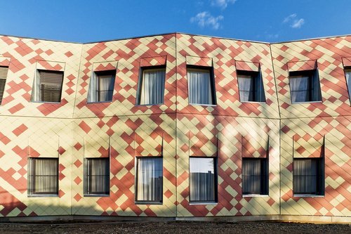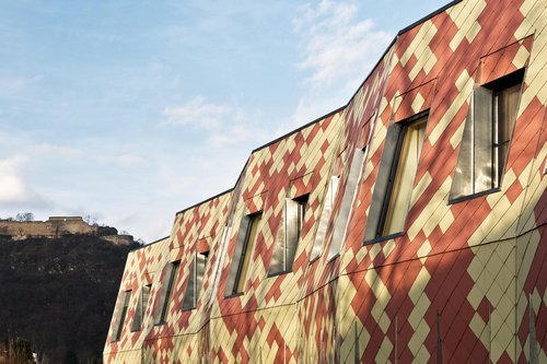 Über die Faltung hinaus passt sich die Gebäudehaut chamäleonartig über die Länge des Baukörpers an sein Umfeld an und schafft auch so lokale Differenzierung bei gleichzeitiger Wahrung der globalen Kohärenz. Die Faserzementschindeln pixelieren die Fassade mit einem zweifärbigen Verlauf, der sich farblich zum einen dem bestehenden Altbau und zum anderen der umliegenden grünen Natur anpasst.