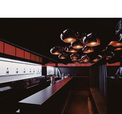 Das Design des Lokals als Tunnel ist auf dem Bewegungsstrom der Gäste ausgerichtet. Zwei Funktionselementen begrenzen bzw. umrahmen diesen Strom: Eine organische, spiegelnde Wandschale mit gepolsterten, beleuchteten Sitznischen sowie der kantige Stahltresen der Bar. Vielfach eingesetzte Spiegel lassen das Lokal einerseits größer wirken, tragen zugleich aber auch zur Verdichtung des Trubels bei. Für die dem Konzept entsprechende Beleuchtung sorgen rund einhundert kupferne Kugellampen. Dekorativ spenden sie von der Decke her gedimmtes Licht, um das nächtliche Treiben im richtigen Ausmaß, also wenig, zu erhellen. Als einzige zusätzliche Lichtquelle dienen über der Bar angeordnete LCD-Schirme, auf denen unterschiedliche Visuals inszeniert werden können.